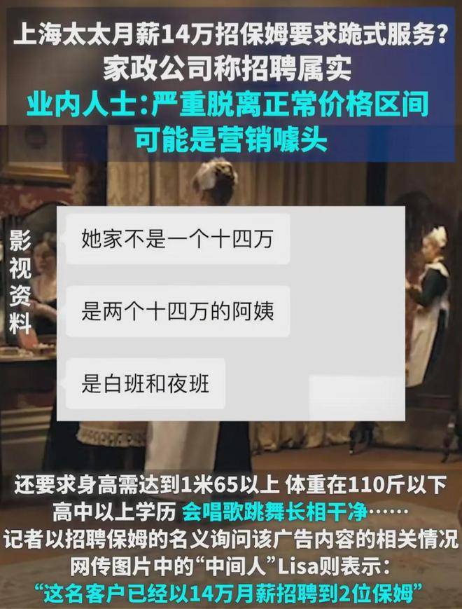 这个招聘启事是从上海一个家政公司发出的,对方表示该招聘信息属实。还有个中间人叫Lisa。