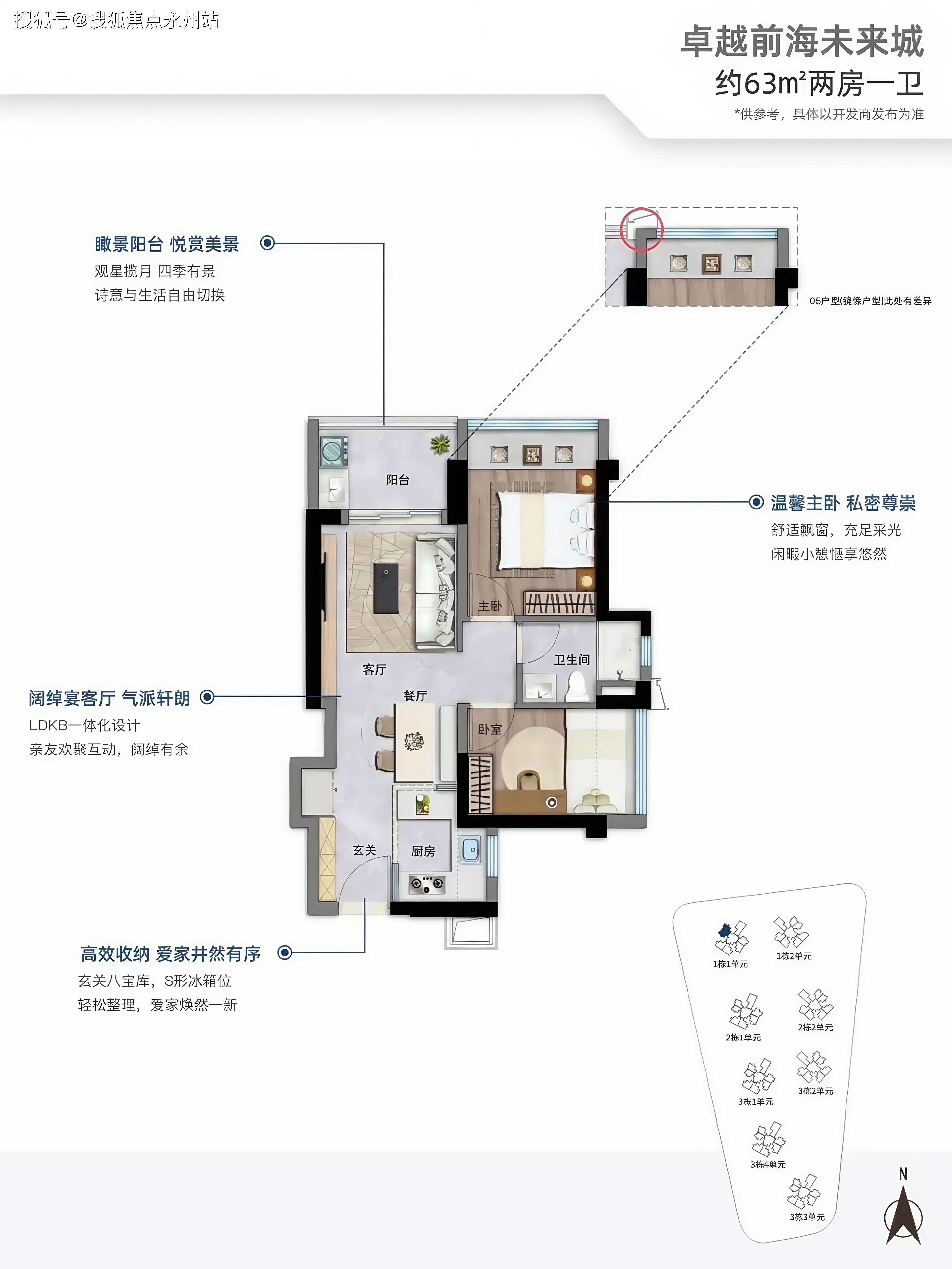 项目位于前海扩容区内,这次推出的起步面积更小,63㎡2房起,带精装,大社区,门口就是“海上田园东”站。