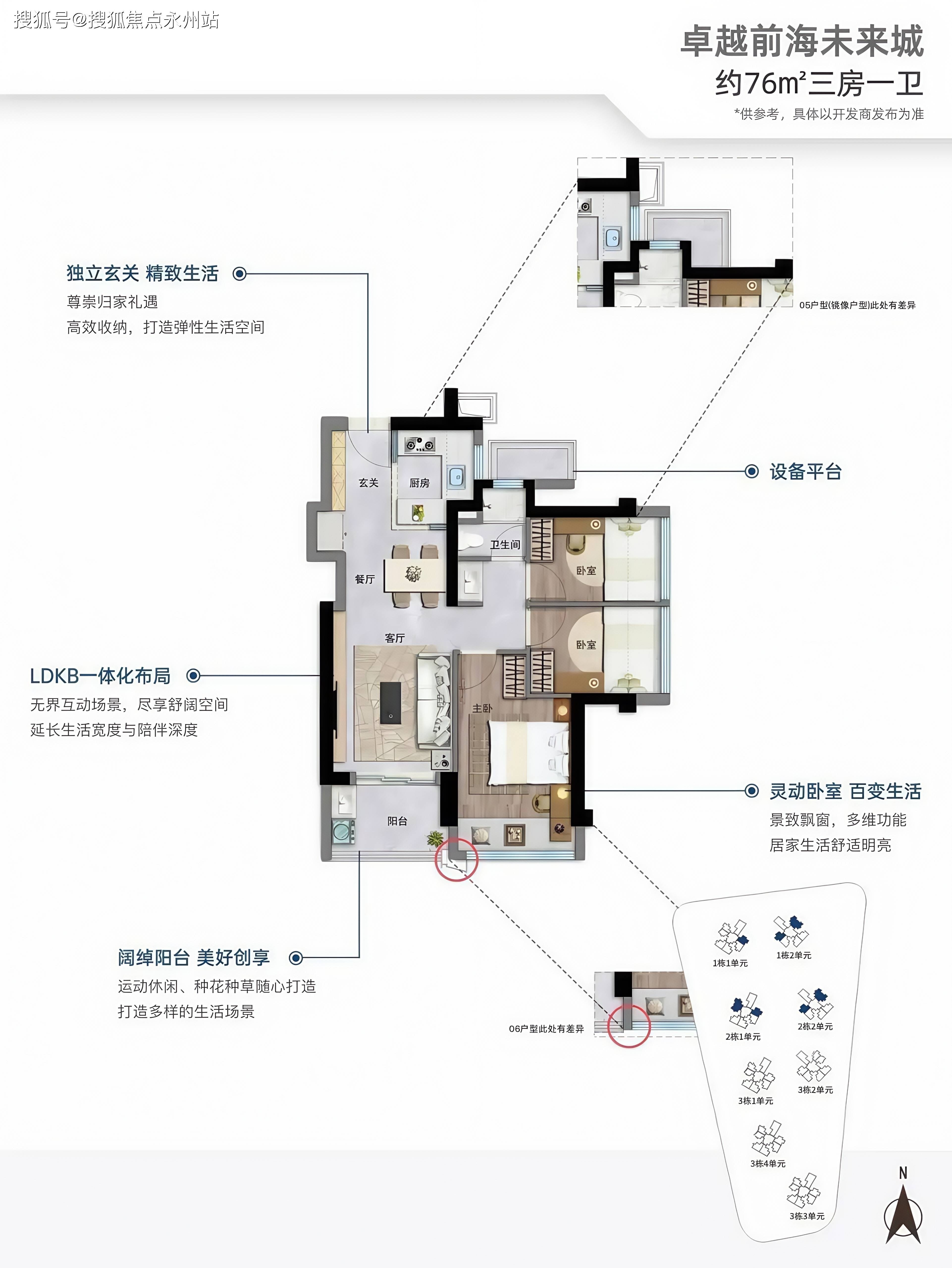 三开间朝南,主卧套房设计(带独立卫浴),双阳台连通 LDKB 空间,部分房源可俯瞰海上田园景区。