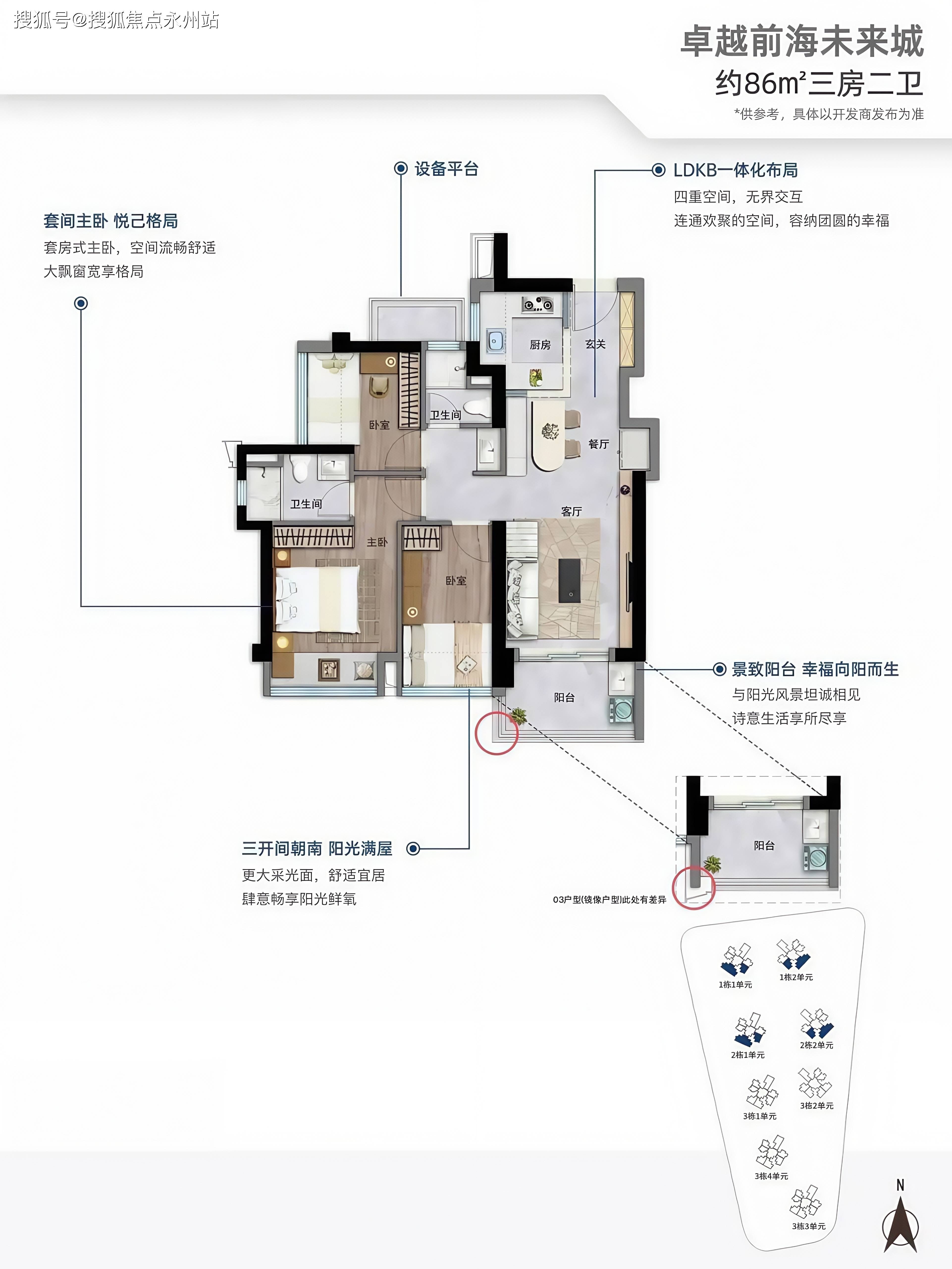 三段式卫生间(洗手台外置),设备平台可改造为家政间,南北双阳台设计,主卧 2.95 米开间,满足三代同堂需求4。