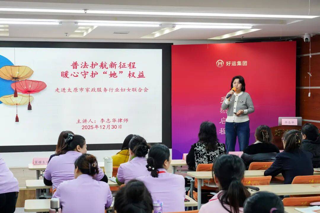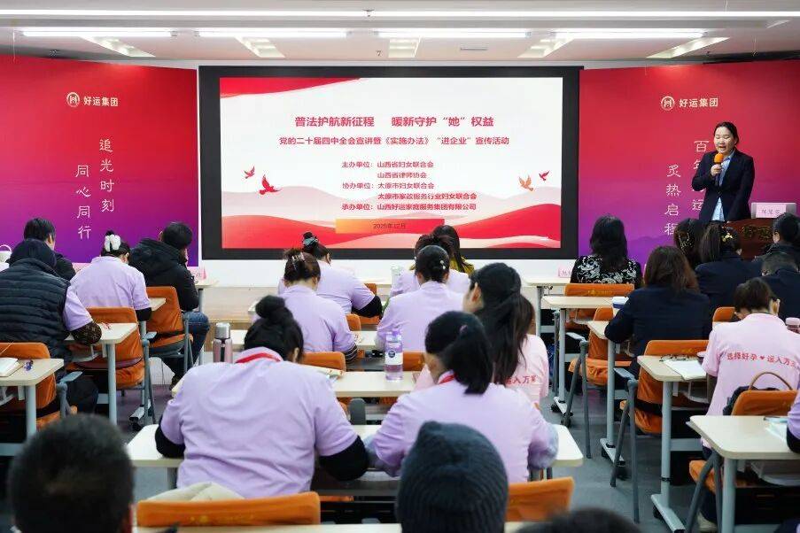 12月30日,由山西省妇联、省律师协会主办,太原市妇联、太原市家政行业协会妇联协办的党的二十届四中全会精神宣讲暨《实施办法》“进企业”宣传活动在山西好运家庭服务集团有限公司总部举行。活动以“普法护航新征程 暖新守护‘她’权益”为主题,家政行业协会部分企业负责人及从业妇女代表等50余人参加活动。