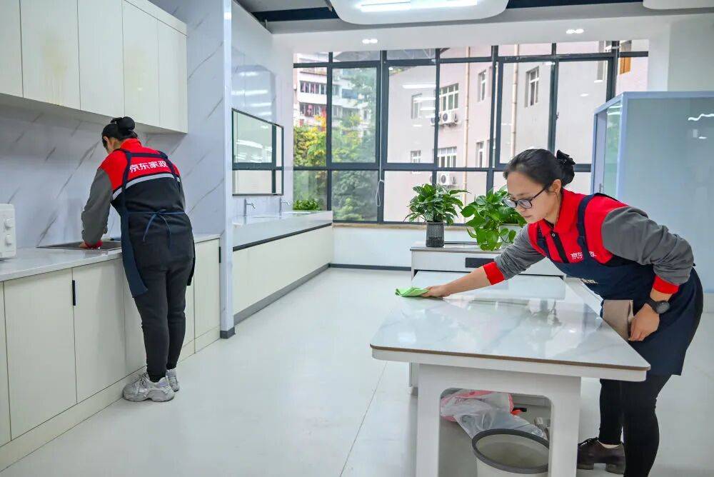 京东家政打造了行业首个三级培训基地模式,纵向覆盖从一线城市核心基地到乡镇培训站点,形成城乡联动的服务网络;横向打通招聘、培训、就业环节,通过标准化管理提升行业服务水平。“实景教学+包吃包住”是基地的一大特色,新启用的培训基地按1:1还原了卧室、厨房、浴室等家庭场景,开设了日常保洁、家电清洗、洗衣做饭等家政实操课程。