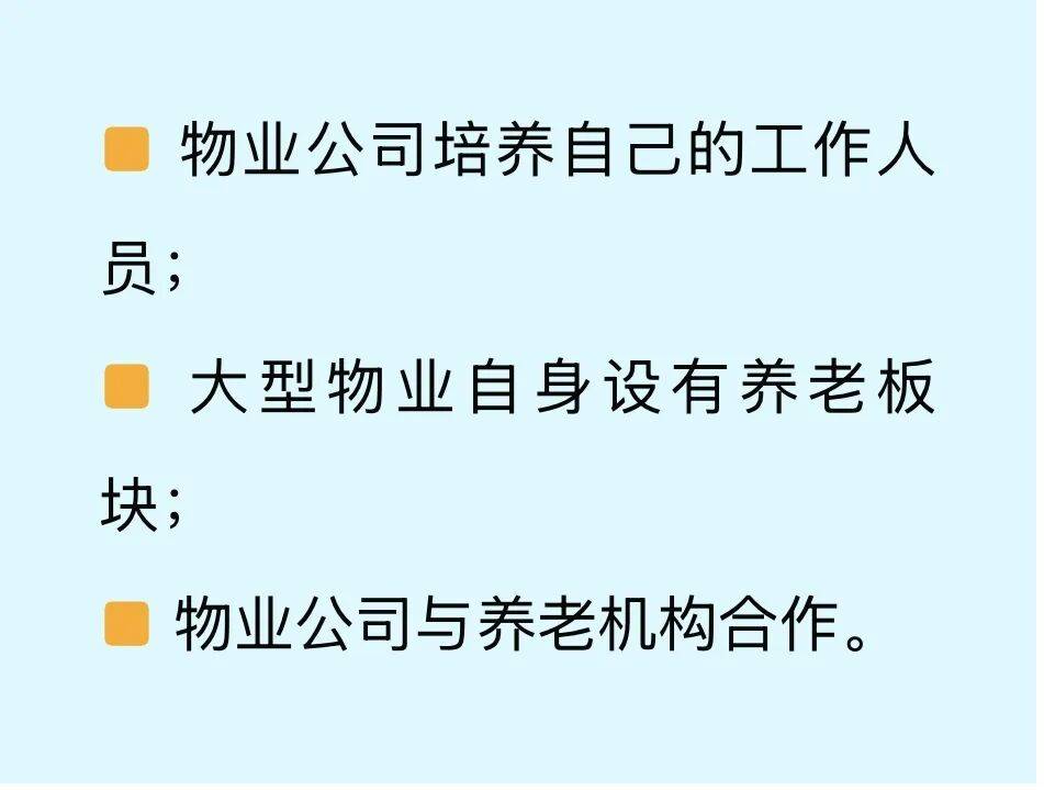 从今后的趋势看,即便物业公司设有养老板块,还是会在一些护理等更深层次的细分领域与专业机构合作。