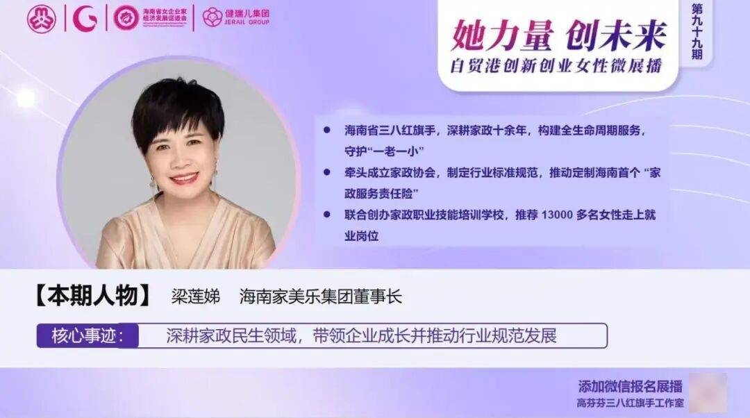 梁莲娣,海南省三八红旗手、海南家美乐集团董事长、海口市家庭服务业行业协会会长、中国妇女第十三次代表大会代表。她深耕椰城家政与民生服务领域十余年,带领企业从“一张桌子、一部电话” 的小门店,成长为覆盖家政、养老、托育、职业培训、物业服务、社区餐饮的全生命周期民生服务集团。