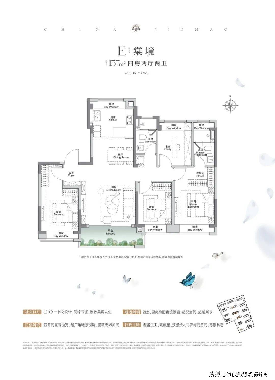 建面约137、152㎡4房2厅2卫,空间布局非常相似,都做到了四开间朝南+入户玄关+6飘窗+主卧套房设计,所有空间的尺度一步到位。