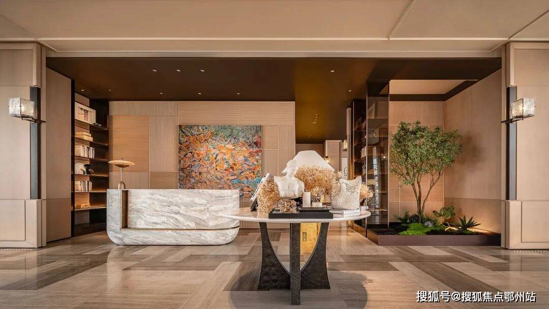 项目打造有雅奢酒店式入户门庭,入口采用三重弧形石材背景墙+圆角幻彩穿孔顶,搭配潺潺流动的中央水景,仪式感扑面而来。