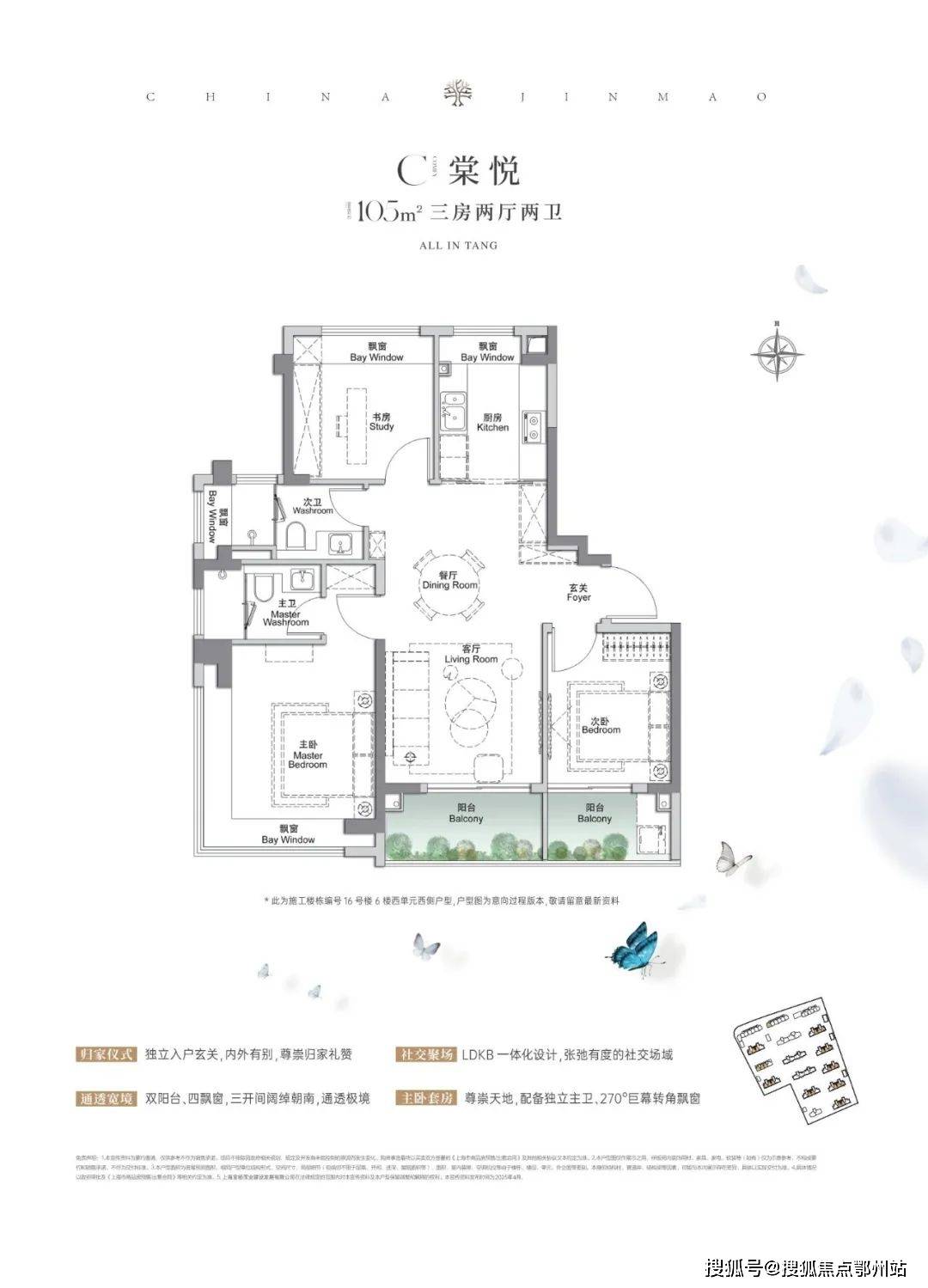 建面约105㎡3房2厅2卫,做到了三开间朝南+4个飘窗+双面阳台系统+主卧套房设计+270°转角飘窗,附加空间非常多。