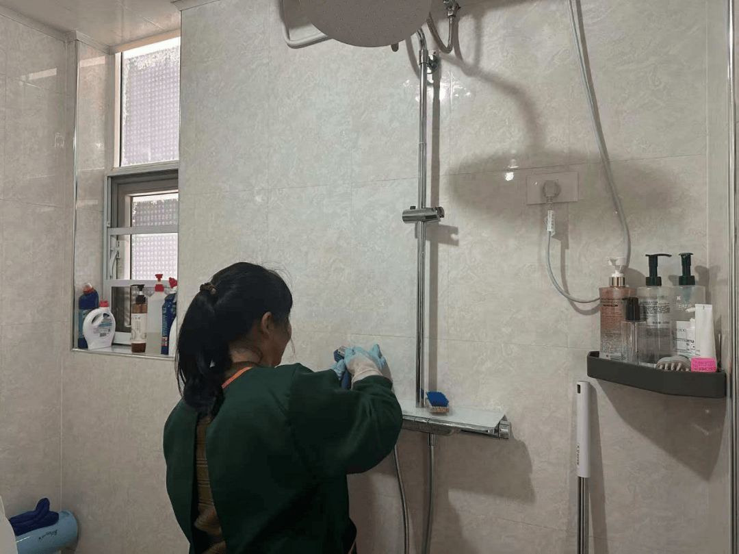 “客户对房屋清洁标准要求明显提高,尤其是卫生间、厨房这些难打理的区域,必须全方位洁净才能让客户满意。我们要清理好几次,我这是第一次,等下还要两次清理,擦到很亮很干净,一点水渍没有,才算结束卫生间。”家政员刘长昌说。