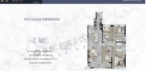 建面约140㎡高端四房,是项目的高端户型,四房两厅三卫设计,奢阔空间,品质感拉满。该户型采用南北通透设计,客厅与餐厅相连,形成超大活动空间,连接南北双阳台,通风采光极佳;主卧套间设计,空间奢阔,配备独立卫生间、步入式衣帽间与全景飘窗,私密性强,同时可欣赏山体景观;两个次卧为套间设计,配备独立卫生间,另外一个次卧空间宽敞,可作为书房或儿童房;厨房为开放式设计,搭配中岛台,操作便捷,适合高端社交与家庭聚会;三个卫生间均采用干湿分离设计,配备高品质卫浴设施,全方位满足高端家庭的居住需求。